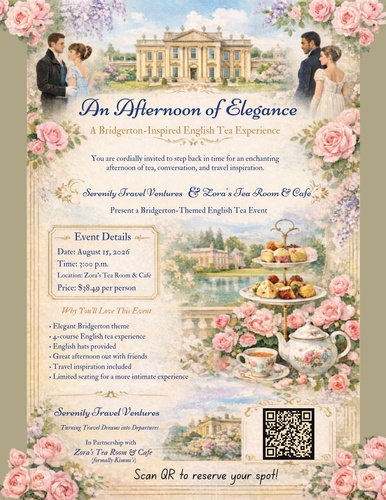 Name: An Afternoon of Elegance: Bridgerton-Inspired English Tea ExperienceDate: August 15, 2026Time: 3:00 PM - 5:00 PM CDT